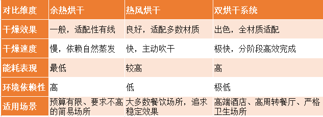 1.预算有限的中小型餐厅:若以陶瓷餐具为主,对干燥速度要求不高,后厨通风良好,可选择余热烘干机型,需接受不锈钢、塑料餐具可能需二次处理。