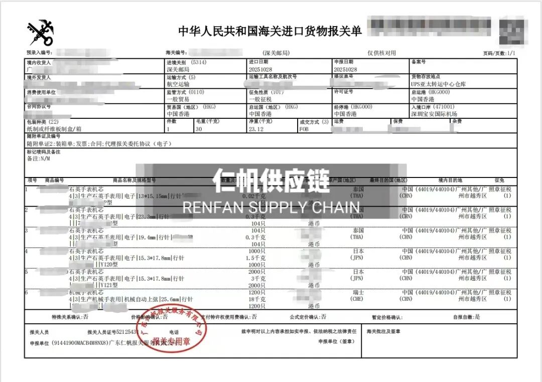 下面仁帆供应链为大家分享一下近期我司近期操作石英手表机芯进口案例!