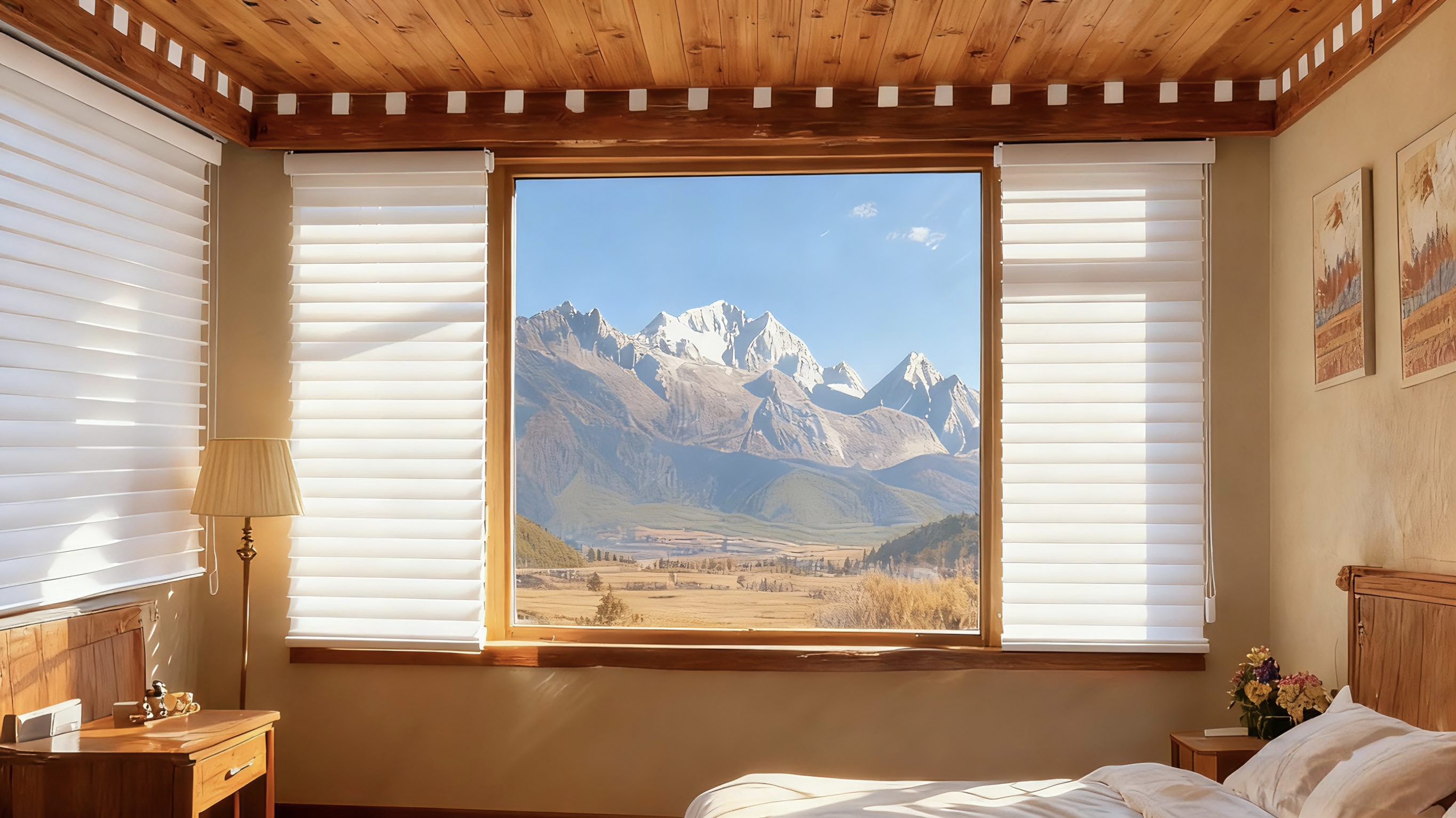 香格里拉的浪漫,也藏在 “不违和” 的融合里,这正是瑞丽思特窗饰的设计初心。这片土地的建筑,多带着藏式风情的原木质感与民族纹样,过于华丽的窗饰会打破这份自然和谐,而瑞丽思特的产品却像从这片土地里 “长” 出来一般契合。传统布艺窗帘选用与草原同色系的浅褐、米白,面料带着自然的肌理感,垂坠间似有风吹草动的轻盈;智能卷帘则采用简约的亚麻纹路,与藏式木屋的梁柱相得益彰,即使收起时,也只是一道低调的线条,不破坏窗外雪山与天空的完整画卷。瑞丽思特从不刻意彰显设计,而是让窗饰成为风景的延伸,让室内空间与香格里拉的天地浪漫无缝衔接。
