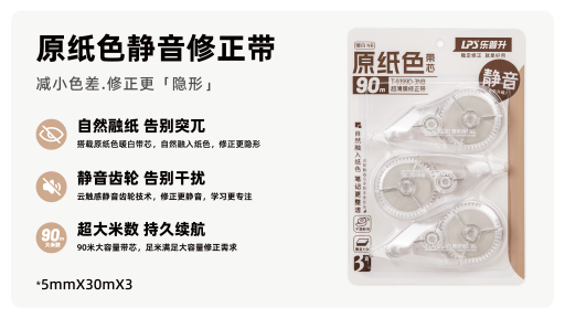 NO.985等原纸色系列修正带,通过接近纸张颜色的原纸色带芯,自然融入纸色,修正更隐形。原纸色隐形修正带专为常见笔记本设计,覆盖后与纸张自然融合,减少突兀感。这一技术创新体现了乐普升对用户需求的深度理解和技术响应能力。