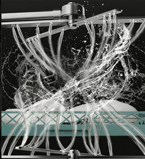 想象一下,在固定的几个位置设置喷水口,水流只能沿着预设的直线路径前进。这种设计会形成大量“清洁盲区”——餐具的侧面、杯子的底部凹槽、碗盘叠放时的夹层,都会成为水流无法触及的阴影地带。就像用手电筒照射物体,背后必然产生影子,固定喷淋系统永远无法实现360°覆盖。