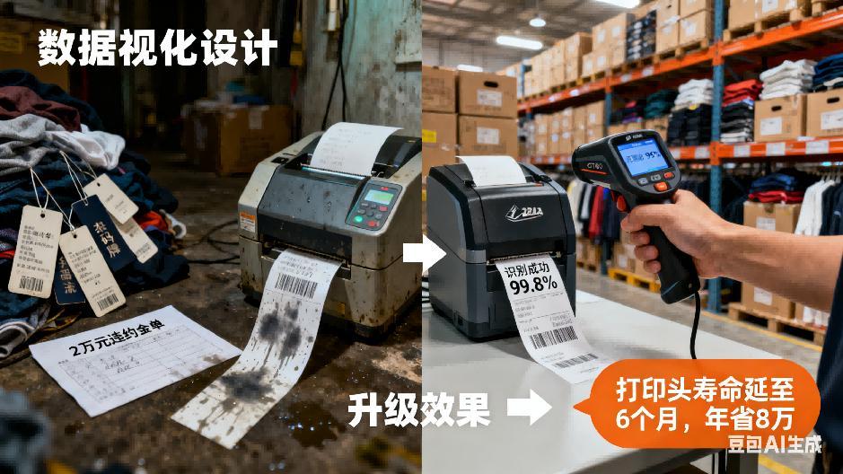 深圳龙华某服装仓储公司的改变很典型。之前用杂牌子条码机,深圳梅雨季节时,打印的衣服吊牌3天就模糊,50多单货扫不出信息发不了,光赔客户违约金就花2万;更头疼的是机器老断针,每月换2-3次打印头,耗材成本比预算高40%。2023年经同行推荐找斯迈尔,选定斑马GT820入门级工业条码打印机,再配上斯迈尔给的斑马原装碳带和标签纸,效果立马出来: