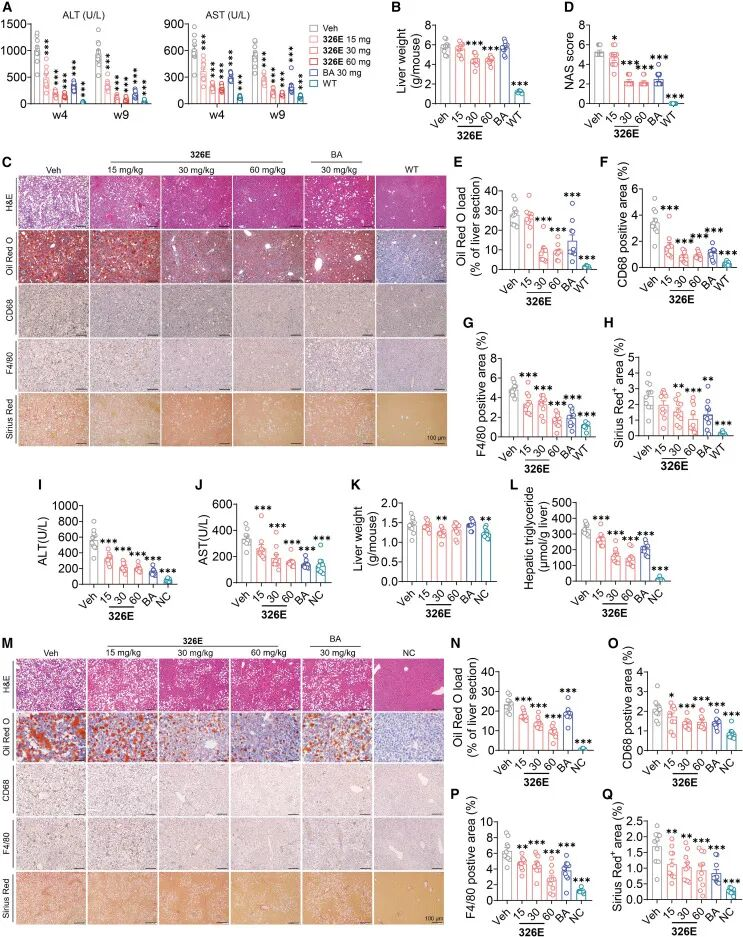 图2.口服326E可改善两种不同的饮食诱导的小鼠MASH模型。
