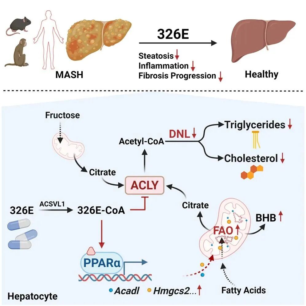 近期,中国科学院上海药物研究所与吉林大学第一医院的研究团队在国际著名期刊Cell Metabolism(IF=30.9)在线发表题为“The enedioic acid analog 326E alleviates metabolic dysfunction-associated steatohepatitis via dual targeting at ACLY and PPARα”(烯二酸类似物326E通过ACLY和PPARα的双重靶向来缓解代谢功能障碍相关的脂肪性肝炎)的研究论文。该研究发现并验证了一种名为326E的新型化合物,它通过同时作用于两个关键靶点(ACLY和PPARα),来有效治疗代谢功能障碍相关脂肪性肝炎(MASH)。