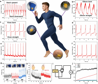 关键性能:传感器灵敏度达217 mV/N,响应时间24.9 ms、恢复时间25.7 ms;可精准监测腕部弯曲、肘部运动、heel冲击(跳跃/ 行走/ 跑步)及鼠标点击,且在湿度、温度变化下性能稳定。