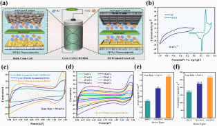 关键性能:5层打印电极(3DP-5LCCNC)质量负载达18.61 mg/cm²,面电容达7.09 F/cm²(是块状电极的8.7倍),面能量密度2.366 mWh/cm²,4000次循环后容量保留率96.31%。