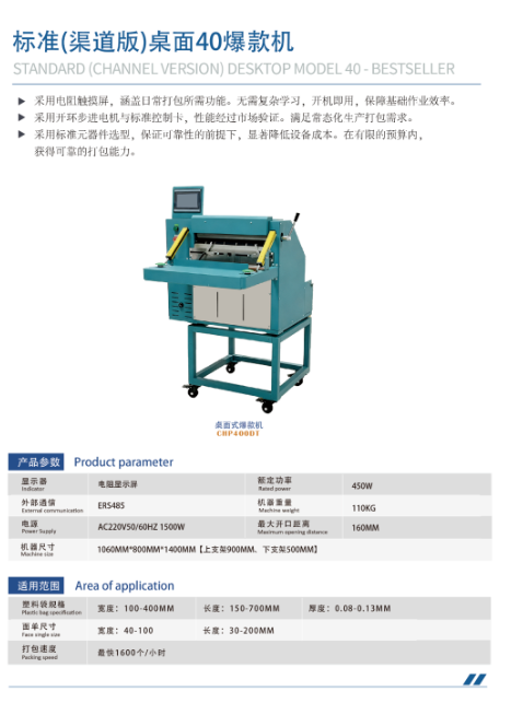 多规格适配能力现代智能打包设备需要具备灵活的规格适配能力。以茄子智能的产品线为例,其标准版40机采用紧凑型桌面式设计,支持100-400mm宽塑料袋,峰值效率可达1600个/小时,较人工效率提升4倍。针对不同应用场景,50/60机系列提供200mm和250mm开口选择,而70机的300mm超大开口则能处理长度达850mm、宽度达650mm的大型包裹。